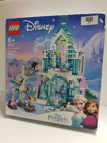 LEGO Disney Frozen Ice Palace set 43172 includes 701 pieces and features characters from Disney's Frozen. Recommended for ages 6 and up, this set allows children to build Elsa's magical palace alongside other accessories. The box provides a detailed view of the assembled set, as well as additional features and included mini-figures.