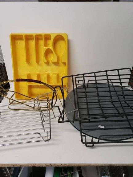 7-piece lot of kitchen items includes a lazy Susan, a yellow utensil organizer, several metal racks of different sizes, and a gold-toned wire storage holder with handle. Items are designed for organizing and serving in a kitchen environment.