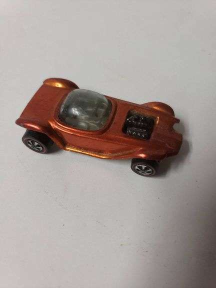 Orange Hot Wheels car featuring an exposed engine detail, a clear bubble dome, and black wheels with silver rims. Marked 'Mattel' and '1968' on the underside. Suitable for collectors.