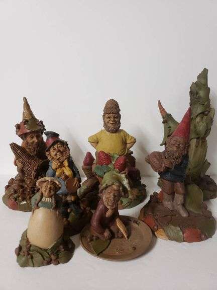 Lot of 7 handcrafted figurines featuring whimsical designs. Several figures include marked signatures: M. Weber (1985) and Twinkle. The pieces depict scenes such as gnomes and characters with hats and baskets, among others. Made with detailed sculpting, and each mounted on decorative bases. Ideal for collectors or decorative purposes.