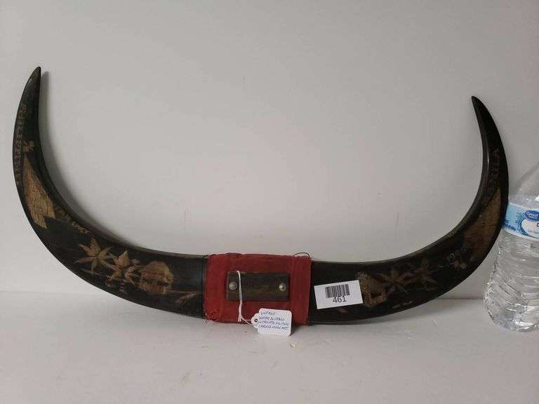 Vintage hand-carved water buffalo horn with intricate Filipino designs, featuring decorative elements like flowers and houses. Center wrapped with red fabric and secured by a wooden plate with screws.