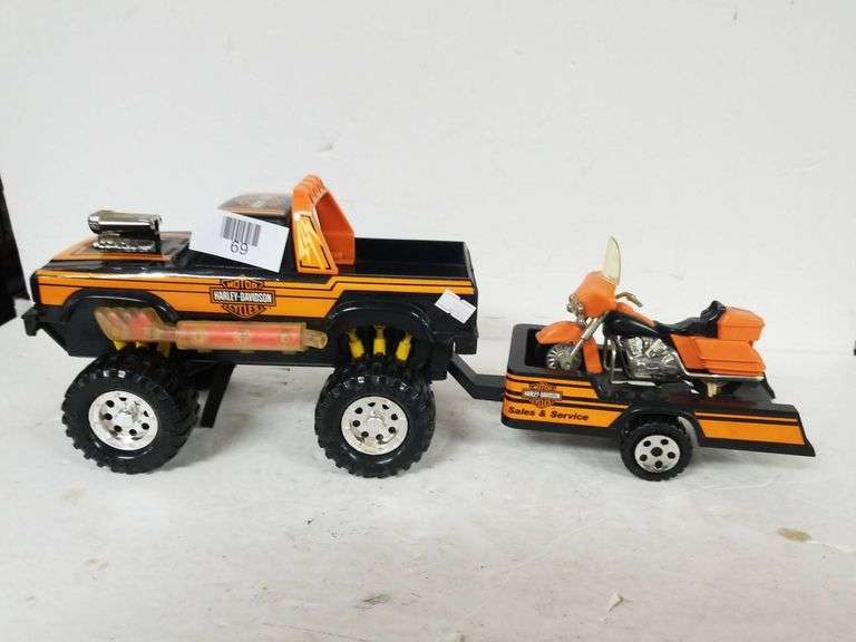 Harley-Davidson themed toy set featuring a rugged, lifted truck with bold orange and black colors and chrome accents. Includes a matching trailer loaded with a detachable Harley-Davidson motorcycle. Truck and motorcycle both sport Harley-Davidson 'Sales & Service' branding. Ideal for collectors or enthusiasts.
