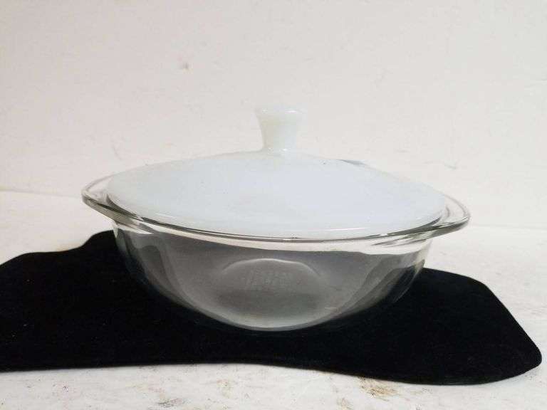 Pyrex round clear glass dish with a matching white glass lid. Suitable for oven and microwave use, as indicated on the embossed base. The dish features a rounded, smooth design with a fitted top knob handle on the lid for easy handling. Made in the USA.