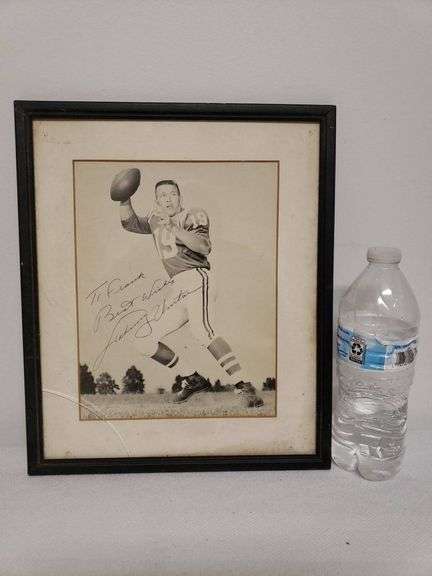 Framed black-and-white photo of a football player in uniform, signed with a personal message. The glass covering the photo is cracked in the lower-left corner. The frame features a simple black border, and the back has a wooden panel for support. The photograph appears to capture an action pose on a field with a football in hand.