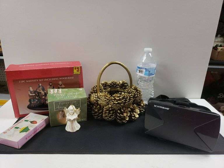 This lot includes a boxed 11-piece nativity set, a set of porcelain angel bells, a basket with gold pinecones, Xtreme 3D VR glasses, and a small pack of educational toy bricks. Great for a variety of uses.