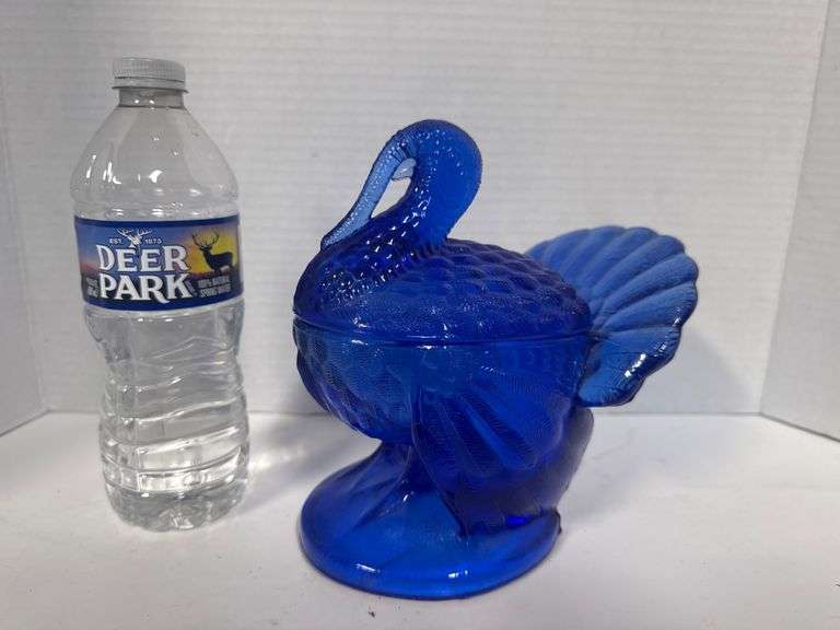 Cobalt blue glass dish in the shape of a turkey, consisting of two parts: a detailed lid sculpted as the turkey’s body and a base shaped as the bird's lower half. The piece features a textured surface and stands on a round base.