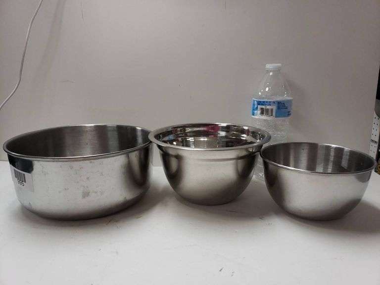 Lot of 3 mixing bowls crafted from stainless steel, offering durability and versatility. The set includes bowls of varying sizes, with two marked "Stainless Steel Made in Japan" and one marked "Stainless Steel Made in Korea." Practical for various kitchen uses, these bowls showcase a polished finish with visible signs of prior use.