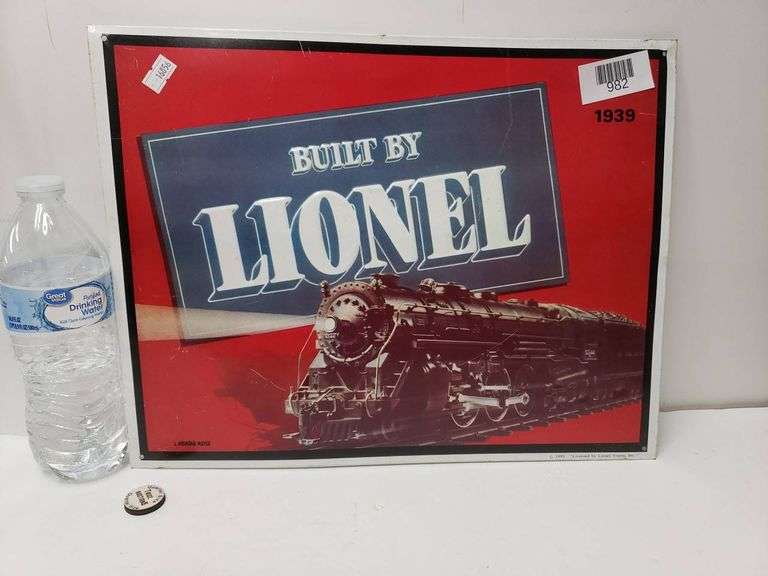 Framed metal sign featuring a 1939 design of a Lionel train with 'Built by Lionel' text. Includes a copyright mark from 1993 and the artist name 'L. Meinrad Mayer'. Licensed by Lionel Trains, Inc., this collectible piece is ideal for train enthusiasts and collectors. Overall dimensions are not specified.