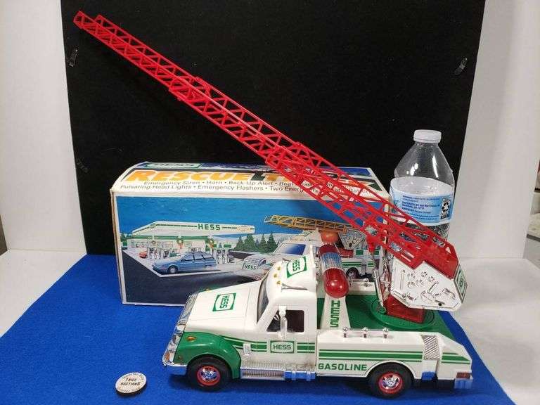 Hess branded 1994 rescue truck with a red extendable ladder and detailed graphics, featuring 'Hess' and 'Gasoline' logos. Includes the original box and some accessories visible. The truck showcase elements and stickers characteristic of Hess toy trucks, with chrome detailing on wheels and other parts. Clear details of the model include its functional ladder and vibrant color accents.