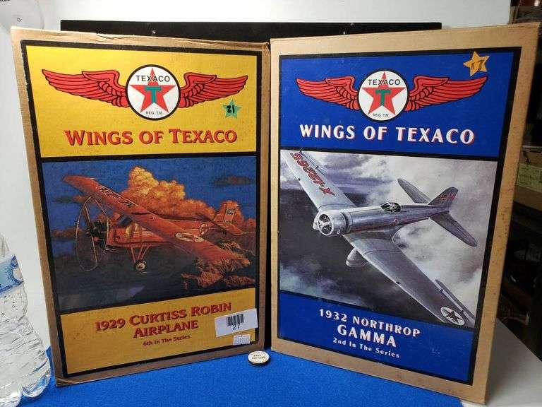 Set of two Texaco ‘Wings of Texaco’ planes: 1929 Curtiss Robin Airplane (6th in the series) and 1932 Northrop Gamma (2nd in the series). Both models include detailed illustrations and historical information on the boxes.