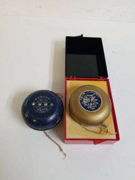 Set of two vintage yo-yos: a blue Duncan Jeweled Tournament Yo-Yo with embedded jewels and a gold Fly-Back Genuine Tournament Return Top featuring intricate branding details. Includes a red and black storage box with an inscription reading, 'If You Want to Get Ahead, You've Got to Have Pull.' A collectible set for vintage toy enthusiasts.