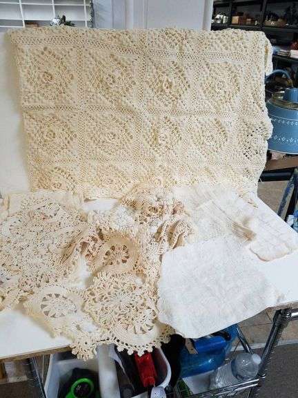 Lot of vintage crochet and lace pieces, featuring intricate patterns and a wide variety of designs. Includes doilies, tablecloths, and other lacework elements. Colors are predominantly cream and beige. Suitable for various decorative or crafting purposes.