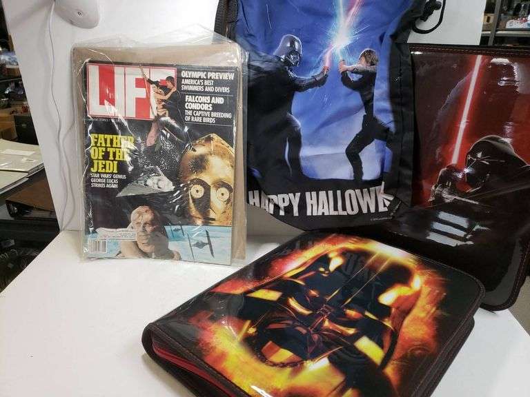 Lot includes a LIFE magazine from June 1983 featuring 'Father of the Jedi' on the cover (sealed in packaging), a Star Wars drawstring 'Happy Halloween' bag depicting a battle between Darth Vader and Luke Skywalker, and two binders with Darth Vader-themed artwork. The binders feature a vivid design, with one showing an interior 3-ring structure and red patterns. Includes five total items.