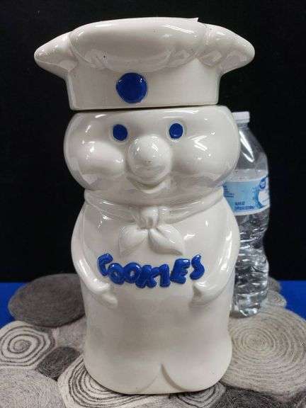Ceramic cookie jar in the shape of a sailor with a white glaze finish and blue accent details. The word 'Cookies' is prominently displayed in blue on the front. Approximately jar-size with interior space for storage and a removable hat-shaped lid. General surface marks and scuffs visible in images.