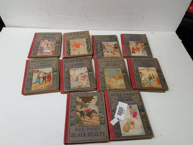 A collection of 10 vintage hardcover books from the Henry Altemus Peter Rabbit series. Titles include "Peter Rabbit's Wedding," "Peter Pan's Wee Folks," "When Peter Rabbit Went A-Fishing," "Peter Rabbit's Easter," "Little Sallie Mandy at the Farm," "Peter Rabbit and the Tinybits," "Peter Rabbit and Little White Rabbit," "Peter Rabbit Goes A-Visiting," "Wee Folks' Black Beauty," and "Peter Rabbit and the Old Witch Woman." Published by Henry Altemus Company. Copyright date on some books is 1921.