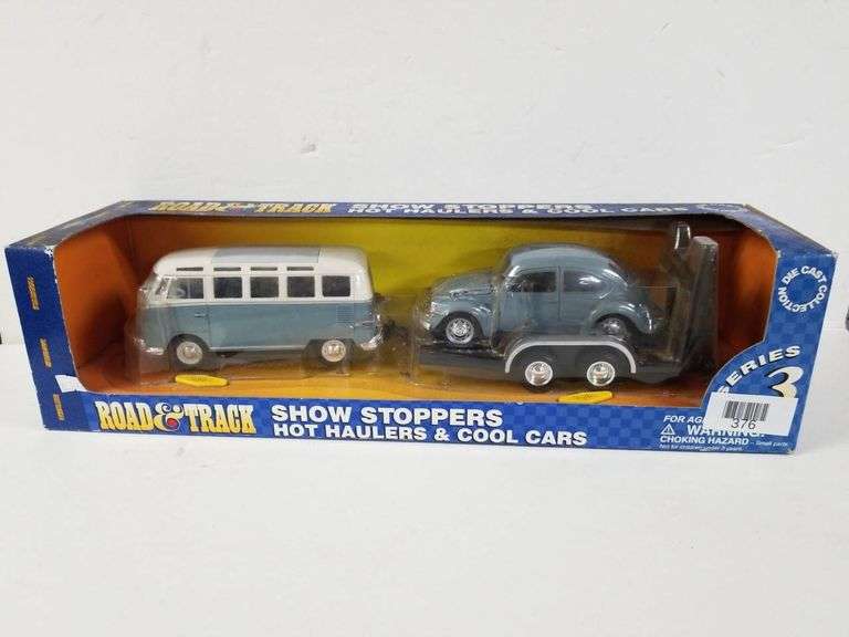 Road & Track Show Stoppers 'Hot Haulers & Cool Cars' die-cast vehicle set featuring a Volkswagen Bus and Beetle with a trailer. Part of Series 3, this collectible set showcases detailed miniature replicas inside an unopened display box. The packaging includes printed visuals of additional sets available in the series.
