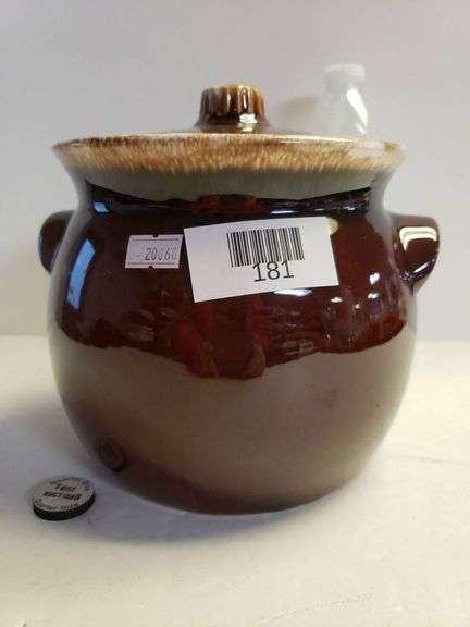 Hull brown glazed earthenware bean pot marked 'Hull Oven Proof USA' on the base. Features a two-handled design with a matching lid. The glaze transitions from deep brown at the body to a lighter brown at the rim. Includes a detailed lid with a knob handle.