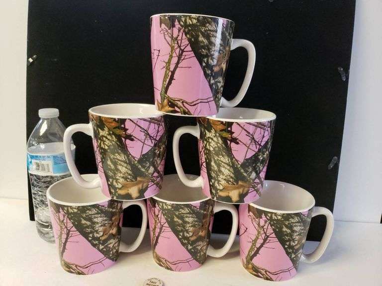 Set of 6 ceramic mugs featuring Mossy Oak pink camouflage design. Each mug is labeled as microwave and dishwasher safe on the bottom. The design includes detailed tree and woodland imagery against a pink background. Ideal for outdoor enthusiasts or as a unique addition to a mug collection.
