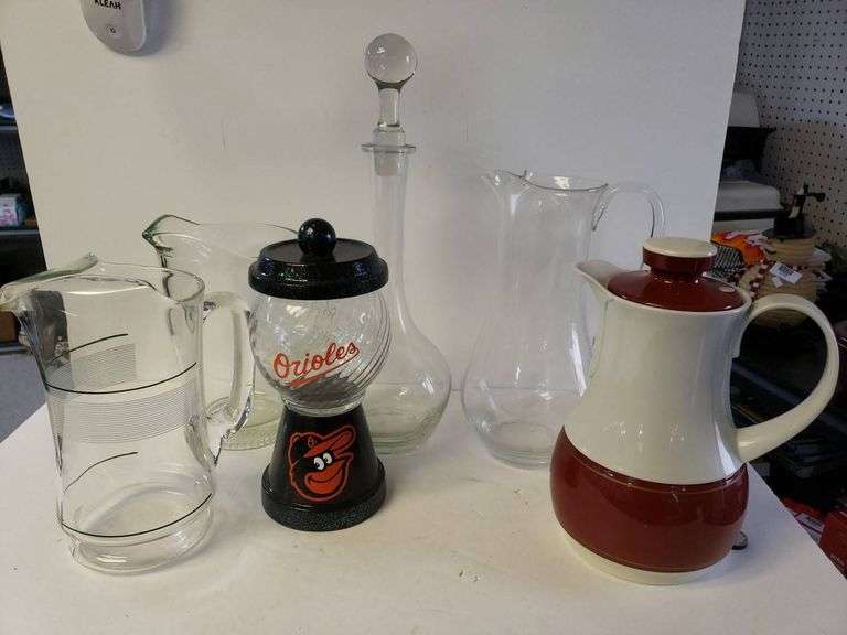Includes glassware items such as a pitcher with green and white stripes, an etched glass decanter with a stopper, two clear glass carafes, a red and white thermos labeled 'Made in West Germany,' and a glittery Baltimore Orioles dispenser.