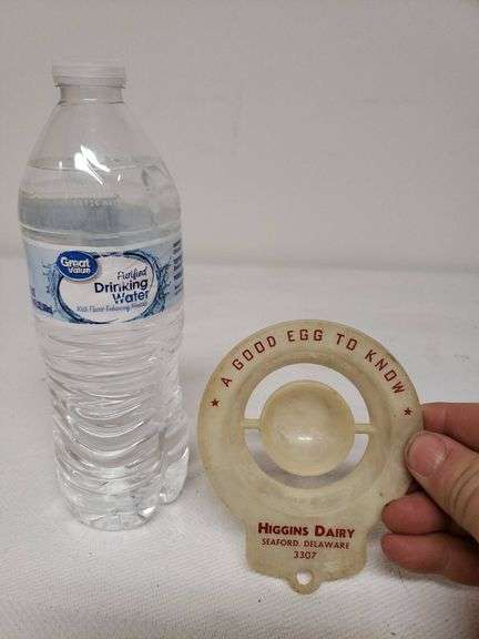 Circular egg separator from Higgins Dairy, Seaford, Delaware 3307. Features the text 'A Good Egg To Know' and advertising in red lettering. Includes a small hanging hole on the handle.