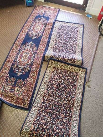 Set includes 3 area rugs with intricate patterns. Brands include Samarkand and Jada Navy. Dimensions are labeled on one rug as 46x24 inches; others are unspecified but vary in size.