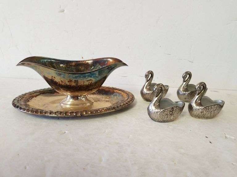 Set includes a silver-colored gravy boat with an underplate and four swan-shaped salt cellars with glass inserts. Elegant design suitable for table settings or display. Includes five pieces in total.