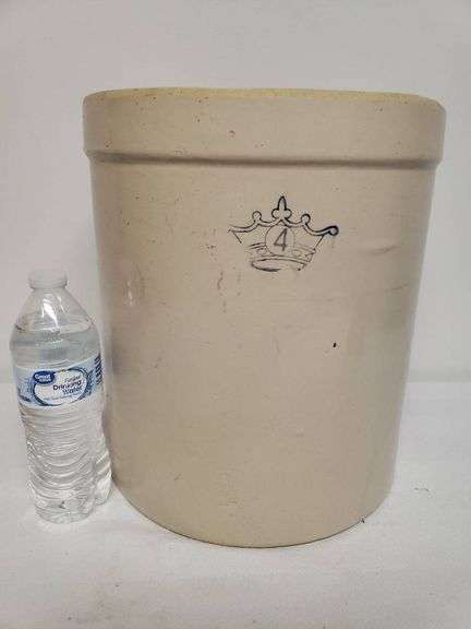 Stoneware crock featuring a crown design with the number '4' prominently displayed. The interior appears darkened, and the bottom is marked 'USA.' The crock is beige in color.