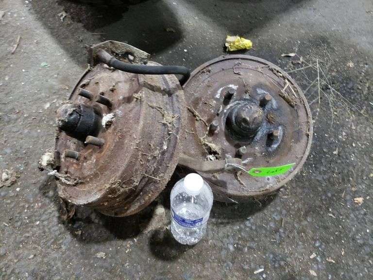 Set of rear drum brake assemblies reportedly from a 1964 Mustang. Includes drums and attached components. Item shows signs of age and wear. Suitable for parts or restoration projects.