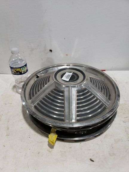 Set of 3 hubcaps featuring the iconic Ford Mustang logo in the center. Designed with a vented spoke design. Suitable for collectors or restoration projects.