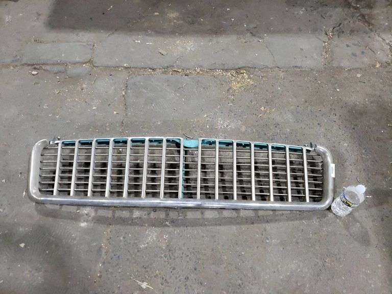 Automobile front grille featuring a chrome grid design and a blue frame accent. Appears to be designed for a specific vehicle model. Suitable for use or restoration projects.