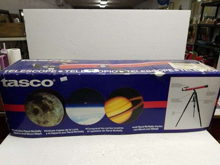 Tasco telescope set includes a red telescope, adjustable tripod, and related accessories. The items come in the original packaging, featuring educational details and images of celestial objects.