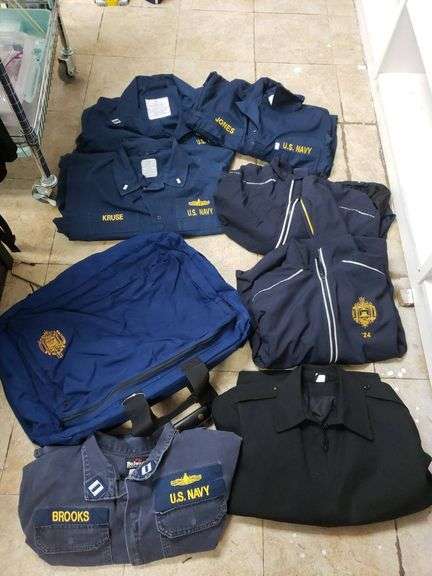Assortment of U.S. Navy uniforms featuring multiple tops with embroidered name patches, a black shirt, and a zip-up jacket. Includes a blue U.S. Navy branded duffel bag with emblem design.