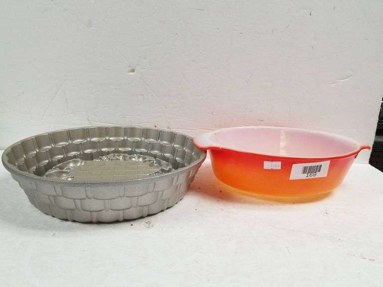 Includes an Anchor Hocking oven-proof glass dish with an orange gradient, and a decorative metal baking mold featuring embossed fruit designs. Both items are suitable for baking or serving purposes.