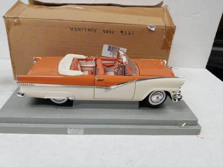 Model car of a 1956 Ford Sunliner convertible, featuring cream and orange coloring with detailed interior and engine bay. Mounted on a display base with a cardboard box included.