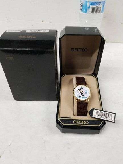 Seiko quartz wristwatch featuring Mickey Mouse, commemorating Walt Disney World’s 25th anniversary. Includes the original box and tag. Brown strap with a gold-tone case and themed dial graphics.