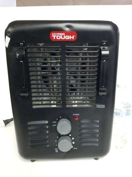 Hyper Tough electric utility heater featuring front-facing adjustable knobs, a power indicator light, and a durable protective housing. Includes a standard power cord for easy connectivity.