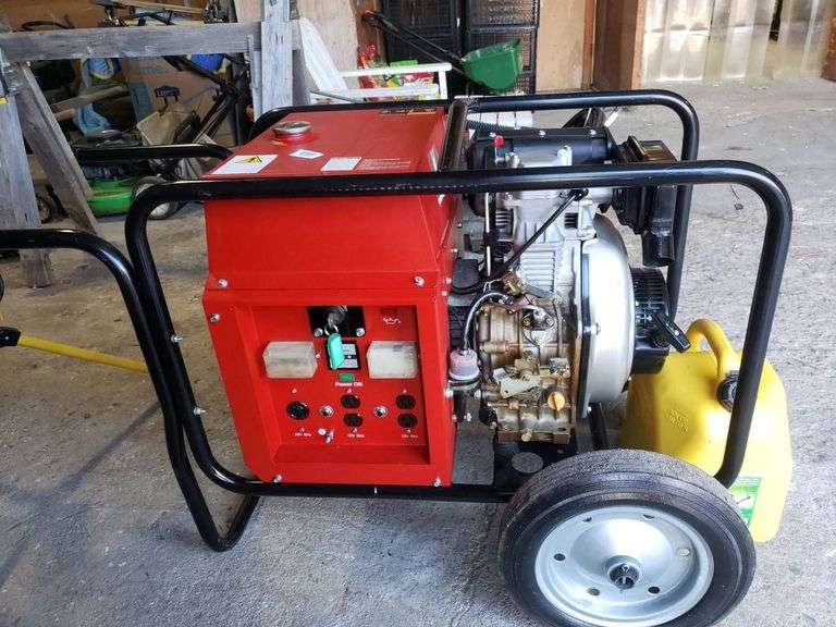 Megavolt MV 6090D generator featuring a Yanmar diesel engine, capable of providing 240V at 25A and 120V at 50A. Includes a fuel tank, battery, and 3 gallons of fresh diesel. Hour meter shows 1.77 hours run time.