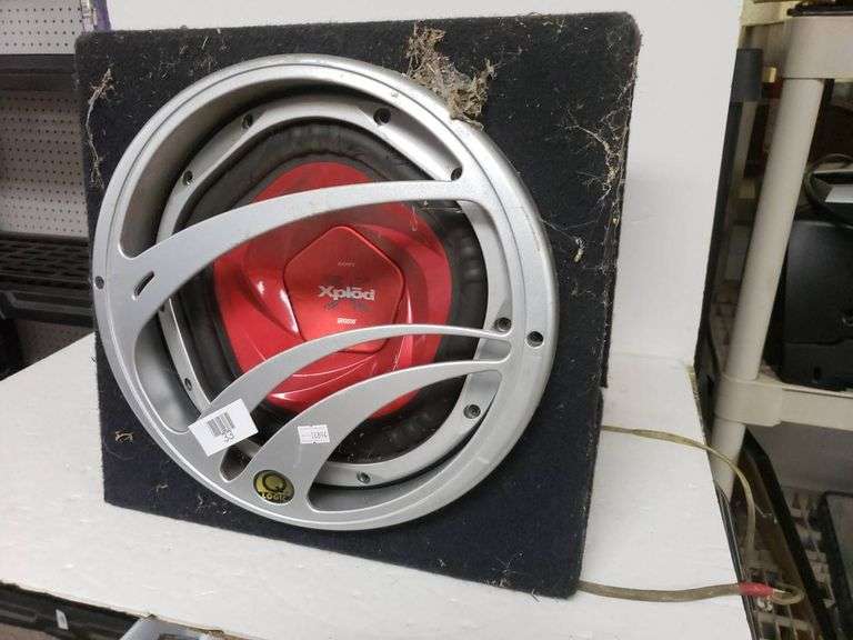 Sony Xplod 1200W subwoofer mounted in an enclosure. Features a red cone with a silver protective grill. Wiring connections are located at the rear of the enclosure.