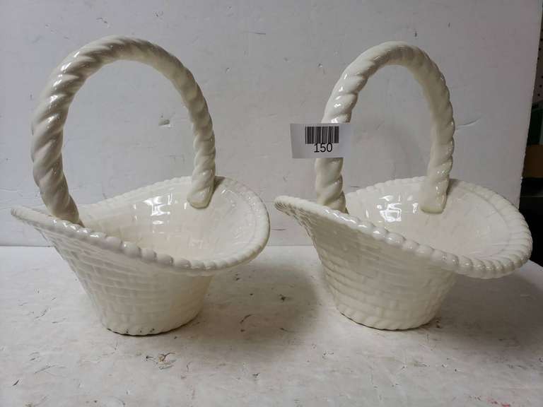 Set of 2 white ceramic basket-shaped bowls featuring twisted handles and a textured surface. Marked 'A88' on the bottom. Suitable for decorative use or collection.