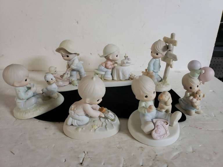 Set of 6 Precious Moments figurines from Enesco's collection, created by Sam Butcher. Includes 'Friends to the Very End,' copyrighted in 1993. Figures depict various childlike scenes with soft pastel colors.