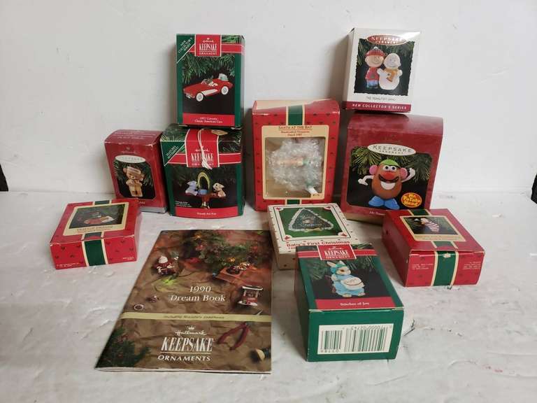 Assorted Hallmark Keepsake Ornaments featuring themes such as '1957 Corvette,' 'The Peanuts Gang,' 'Mr. Potato Head,' and more. Includes Hallmark’s 1990 Dream Book. All items come in original boxes.