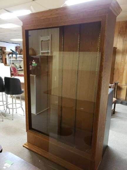 LOT 3145 - Wooden Showcase With Sliding Glass Doors - Window Panel Not In, Missing Piece Of Crowning, No Shelves, Not Tested