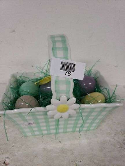 Teleflora basket featuring a green checkered pattern with floral embellishment. Includes decorative grass and an assortment of hand-carved alabaster eggs made in Italy. Basket marked ‘Made in China’.