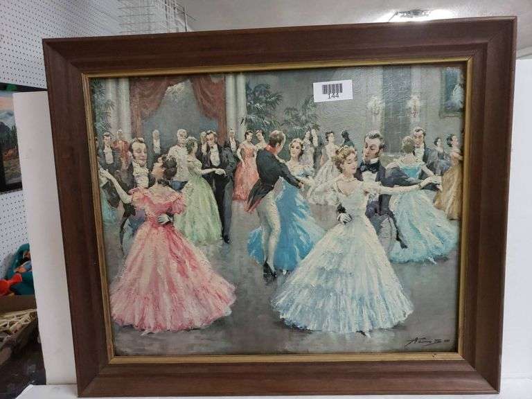 Artwork titled 'Strauss Waltz' by Albo for Winde Fine Prints. Print measures 16 x 20 inches, featuring an elegant ballroom dance scene. Set in a detailed frame, ready for display.