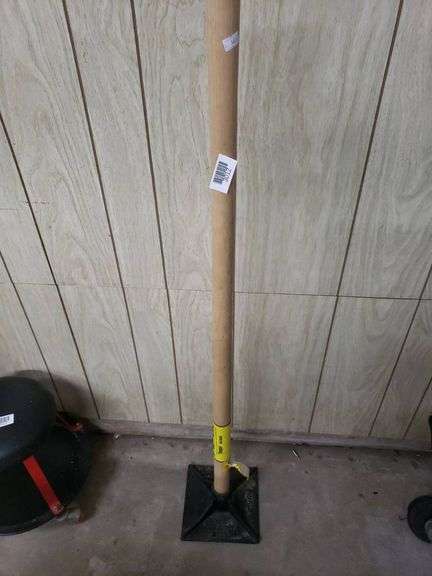 8x8 tamper with a durable ash handle, designed for compaction tasks. Features a metal base with engraved specifications and a sturdy wooden shaft. Ideal for landscaping, construction, or similar projects.