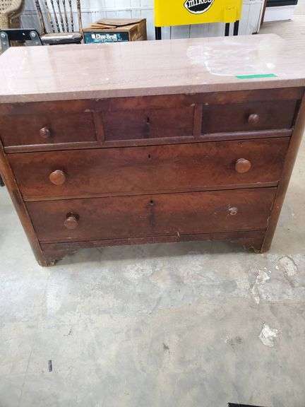 Chest of drawers featuring a solid marble top, described as very heavy. The piece includes multiple drawers and a wooden frame with visible wood grain patterns. Dimensions are approximately 48″ x 24″ x 30″.