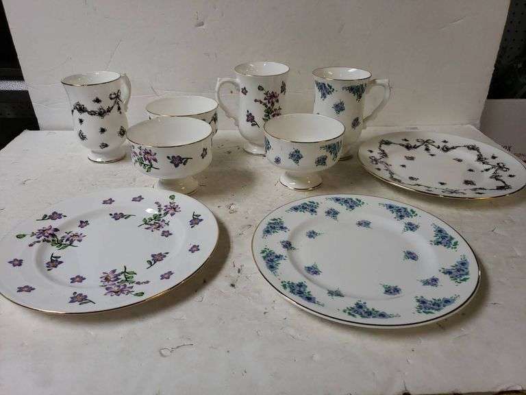 Assortment of Royal Victoria fine bone china tea items from England, including cups, saucers, and mugs. Features various floral and black ribbon patterns with gold-tone accents. Maker's mark present on the base.