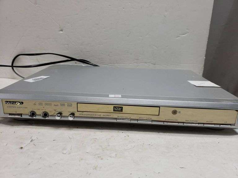 Daewoo DP-420 DVD player featuring progressive scan, mic inputs for karaoke functionality, and support for formats like MP3 and DVD. Includes front control buttons and volume adjustments.