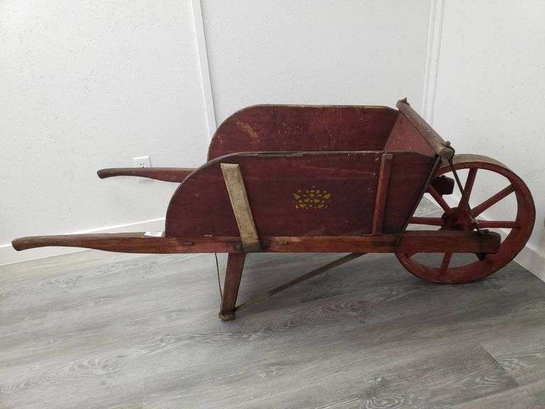 Large red wheelbarrow featuring a single spoked wheel, yellow decorative design on the sides, and sturdy wood-like panels. The design includes supportive metal brackets and a pair of handles for easy maneuvering.