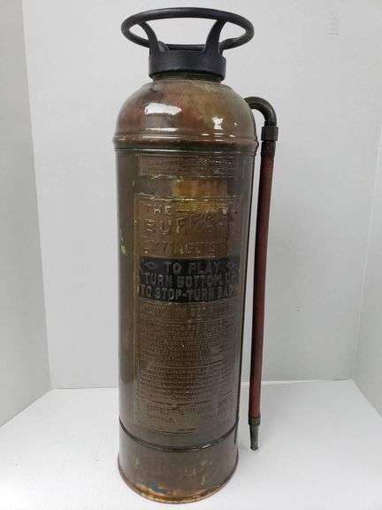 Buffalo Fire Extinguisher featuring a brass body with embossed instructions and maker's marks. Includes an attached hose and a handle at the top. Measures 2ft tall.